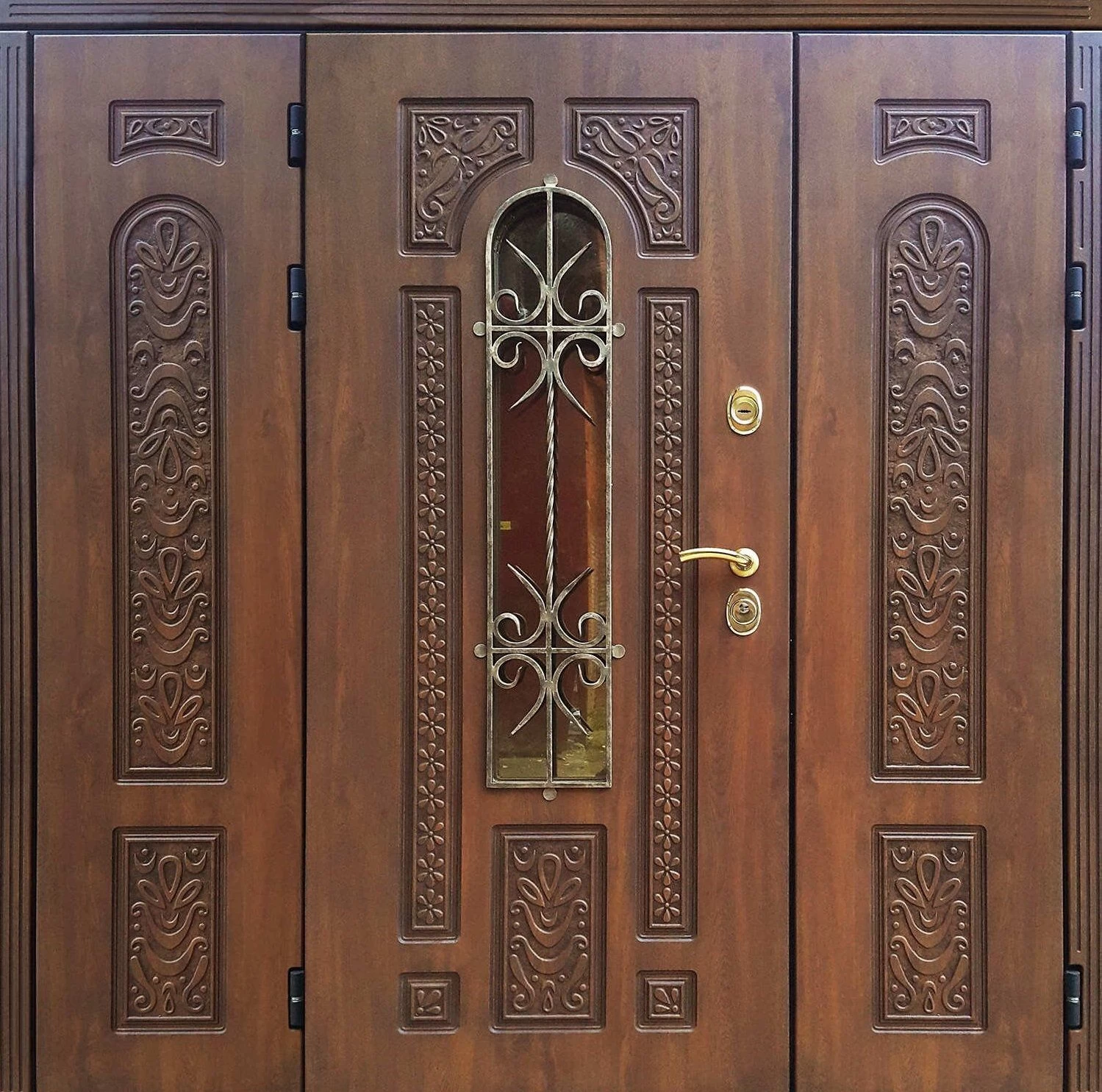 Парадные двери относятся к изделиям премиум-класса. Изготавливаются такие модели из металла толщиной не менее 2,0 мм, конструкция усиливается ребрами жесткости. Основной фактор, делающий парадные двери таковыми – их внешняя отделка. Для декора этих дверей, как правило, используют массив дуба, ясеня или сосны, натуральный шпон, корабельную фанеру, МДФ-панель, покрытую атмосфероустойчивой пленкой Винорит (VINORIT). Декоративные вставки из антивандального стекла, с применением элементов ковки, рисунок, который будет сочетаться с рисунком решеток на окнах, придаст коттеджу неповторимый внешний вид. Можно декорировать дверь витражным узором – и ваш дом заиграет яркими красками. По конструкции парадные двери могут быть как одностворчатыми, так и двустворчатым. При достаточной высоте проема, можно изготовить входную группу с декоративной вставкой сверху – прямоугольную или в виде арки. Терморазрыв в конструкции парадной двери сохранит тепло в доме, и предотвратит промерзание и кондедсирование двери в холодное время года, при этом не требуется обустройство в доме холодного тамбура.
